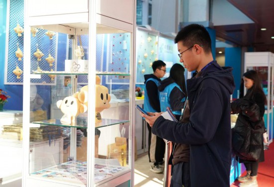 11月29日,在链博会文创小店的柜台上放置着“链氪”形象的文创用品供观展者选购。