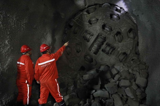 施工人员在查看隧洞贯通后TBM掘进机的状态。新华社发